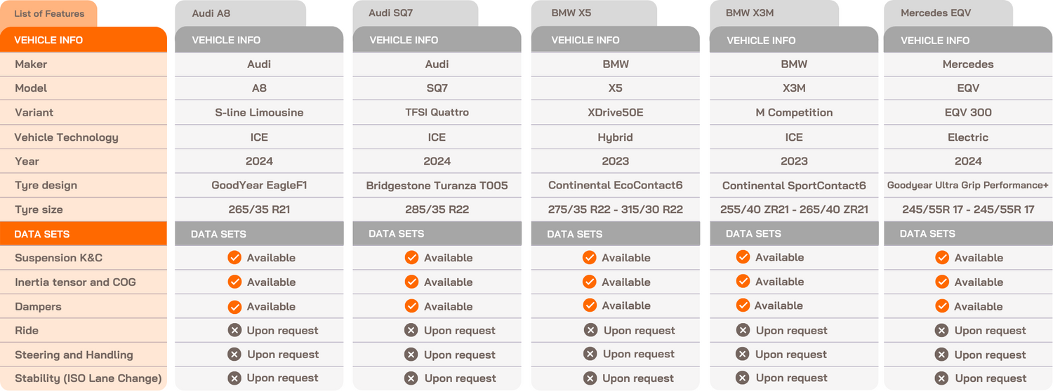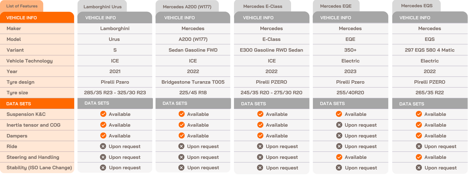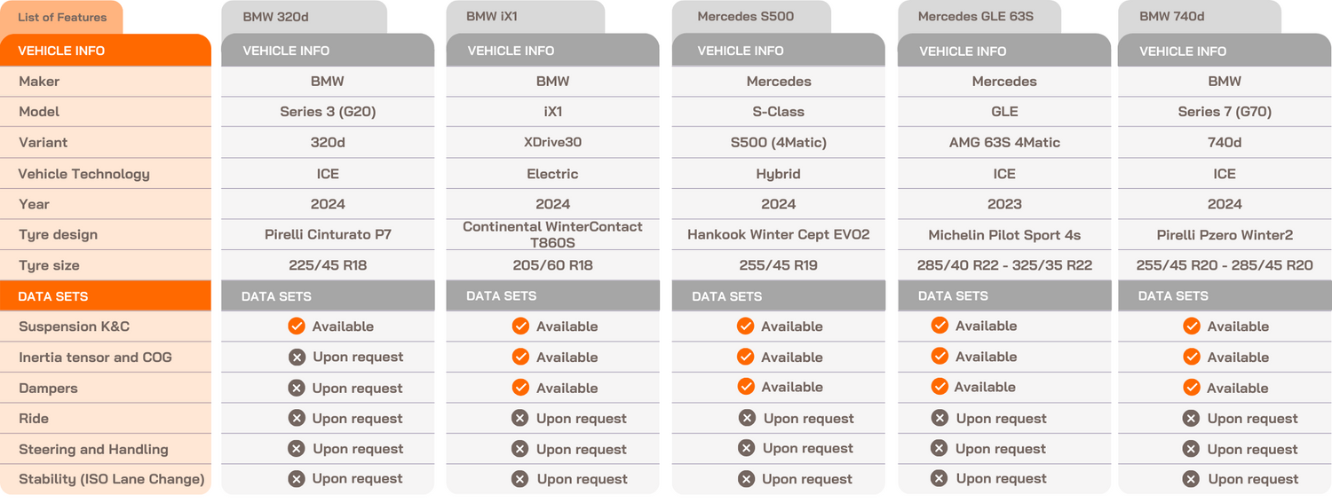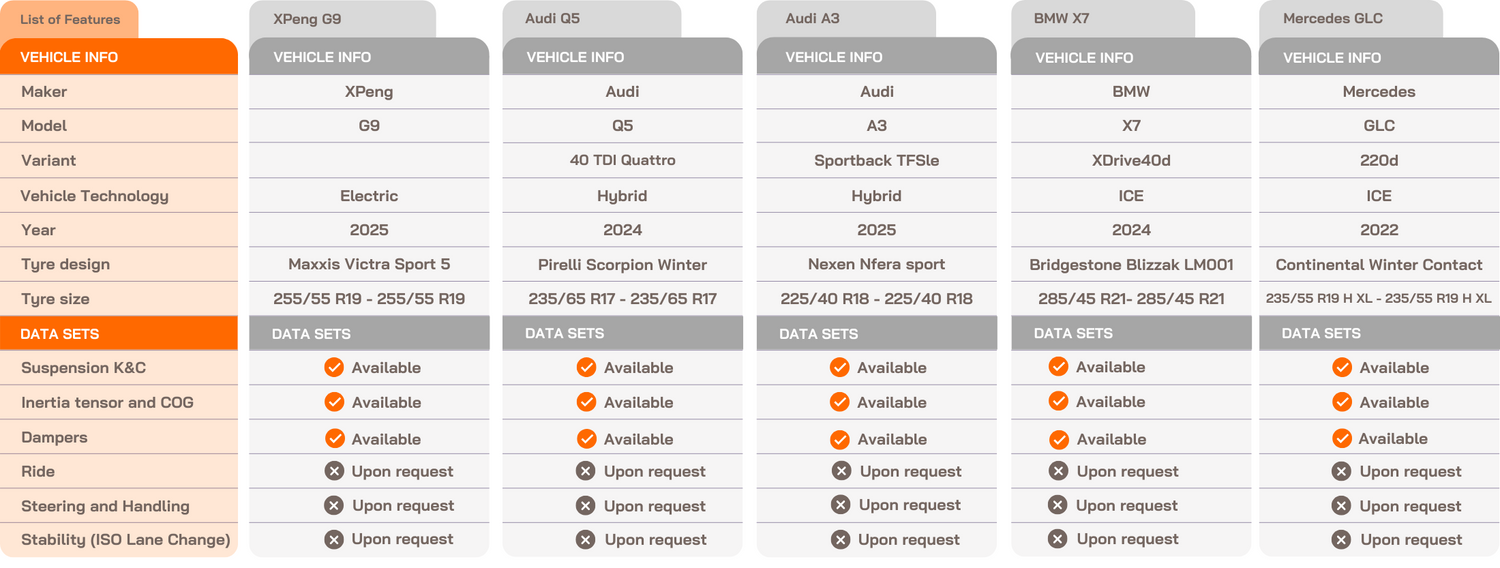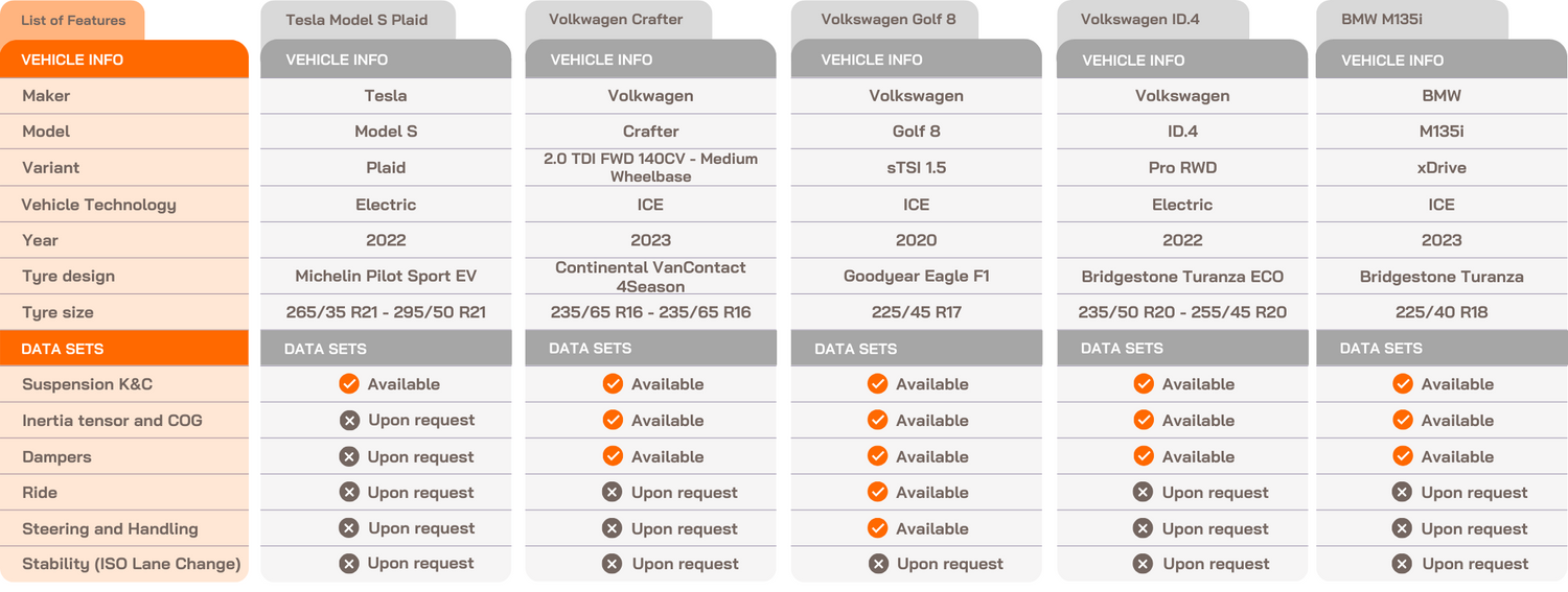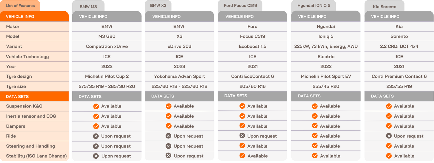 - All vehicles include MF-Tyre models generated by IDIADA or trusted partners that are refined during the correlation with complete vehicle models.